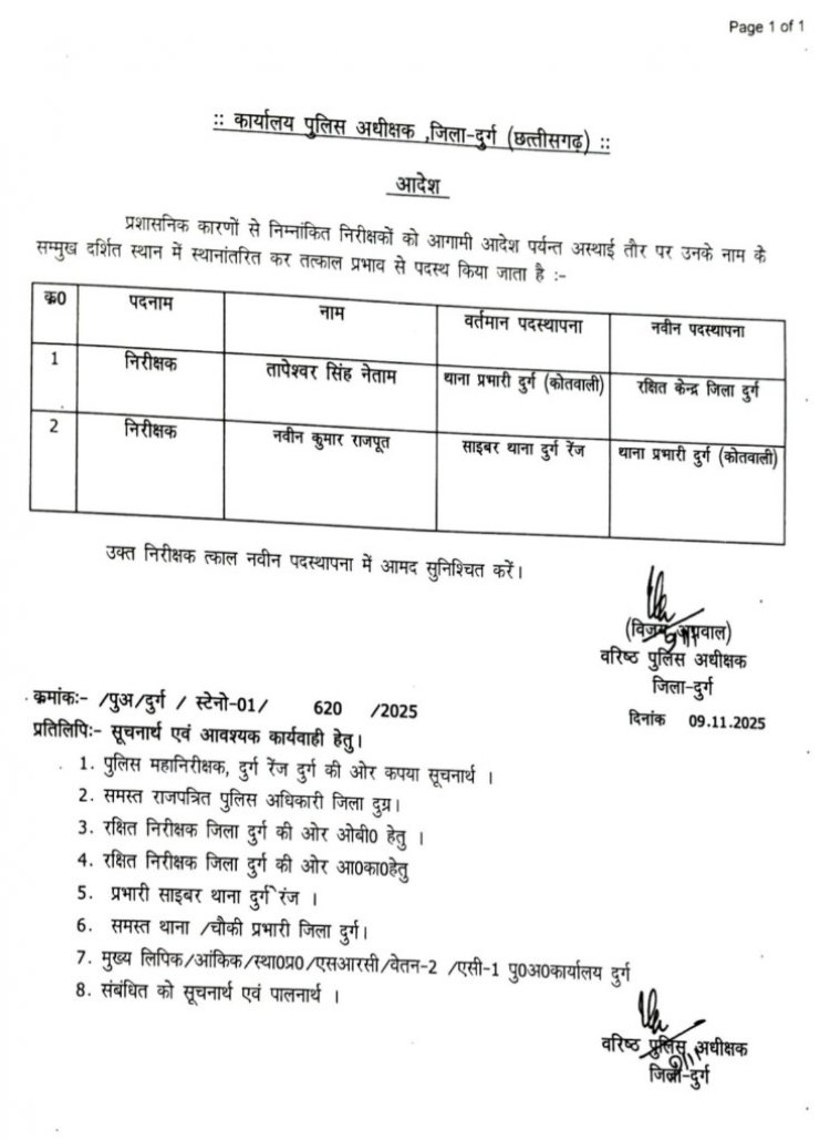 जारी आदेश के अनुसार, तामेश्वर सिंह नेताम जो वर्तमान में थाना प्रभारी दुर्ग (कोतवाली) के पद पर कार्यरत थे, अब उन्हें रक्षित केंद्र दुर्ग में पदस्थ किया गया है। वहीं साइबर थाना दुर्ग रेंज में पदस्थ निरीक्षक नवीन कुमार राजपूत को अब थाना प्रभारी दुर्ग (कोतवाली) का दायित्व सौंपा गया है।