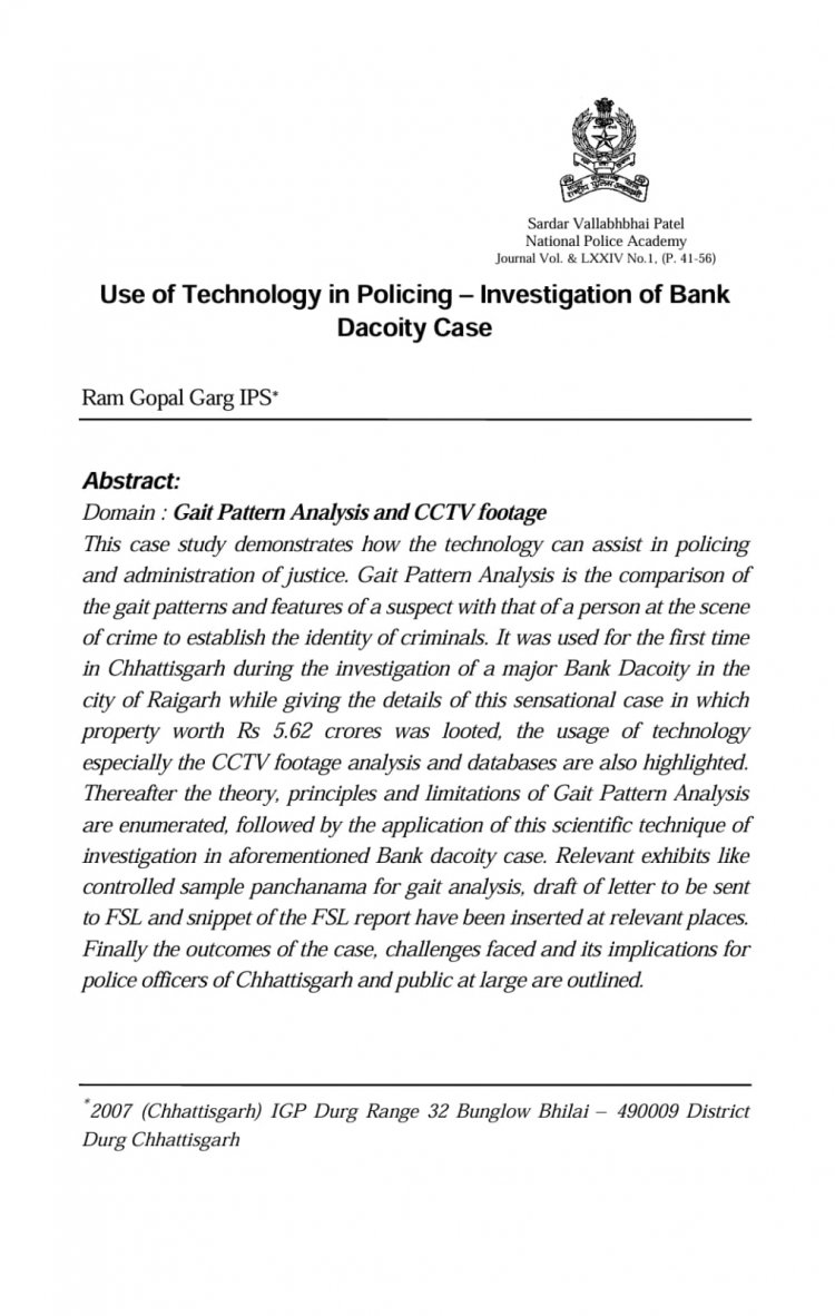 यह शोध लेख तकनीक आधारित अपराध अन्वेषण की दिशा में एक महत्वपूर्ण उदाहरण प्रस्तुत करता है। इसमें श्री गर्ग ने रायगढ़ में हुई एक बड़ी बैंक डकैती की जांच के दौरान Gait Pattern Analysis और CCTV Footage Analysis जैसी अत्याधुनिक तकनीकों के उपयोग को विस्तार से समझाया है।