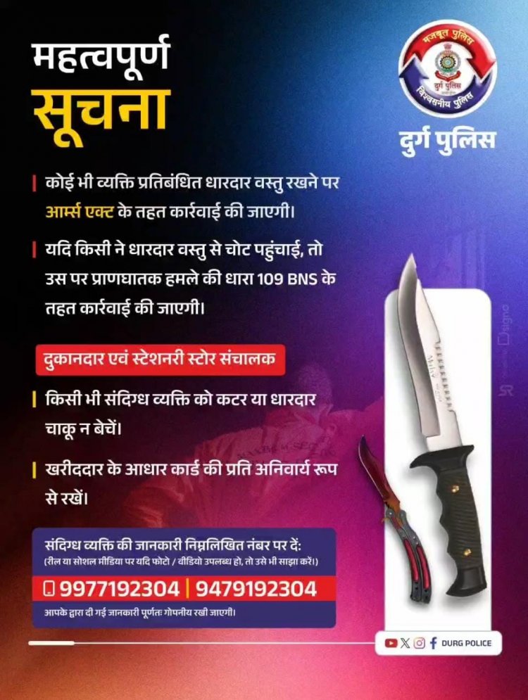भिलाई। थाना छावनी पुलिस ने गौवंश की हत्या के मामले में आरोपी को गिरफ्तार कर जेल भेज दिया है। यह घटना संतोषी पारा कैम्प 02 क्षेत्र की है, जहां आरोपी ने एक गाय को चाकू से घायल कर दिया था। इलाज के दौरान गाय की मौत हो गई थी। पुलिस के मुताबिक, प्रार्थी भारत साहू की रिपोर्ट पर 23 अक्टूबर को थाना छावनी में अपराध क्रमांक 570/2025 धारा 325 बीएनएस के तहत मामला दर्ज किया गया था। जांच में पता चला कि आरोपी नंद कुमार भारती, निवासी संतोषी पारा कैम्प 02, ने लाल रंग की गाय पर चाकू से हमला किया था। विवेचना के बाद पुलिस ने आरोपी को गिरफ्तार कर 25 अक्टूबर को न्यायिक रिमांड पर जेल भेज दिया। आरोपी का नाम: नंद कुमार भारती, निवासी संतोषी पारा कैम्प 02, थाना छावनी, जिला दुर्ग।