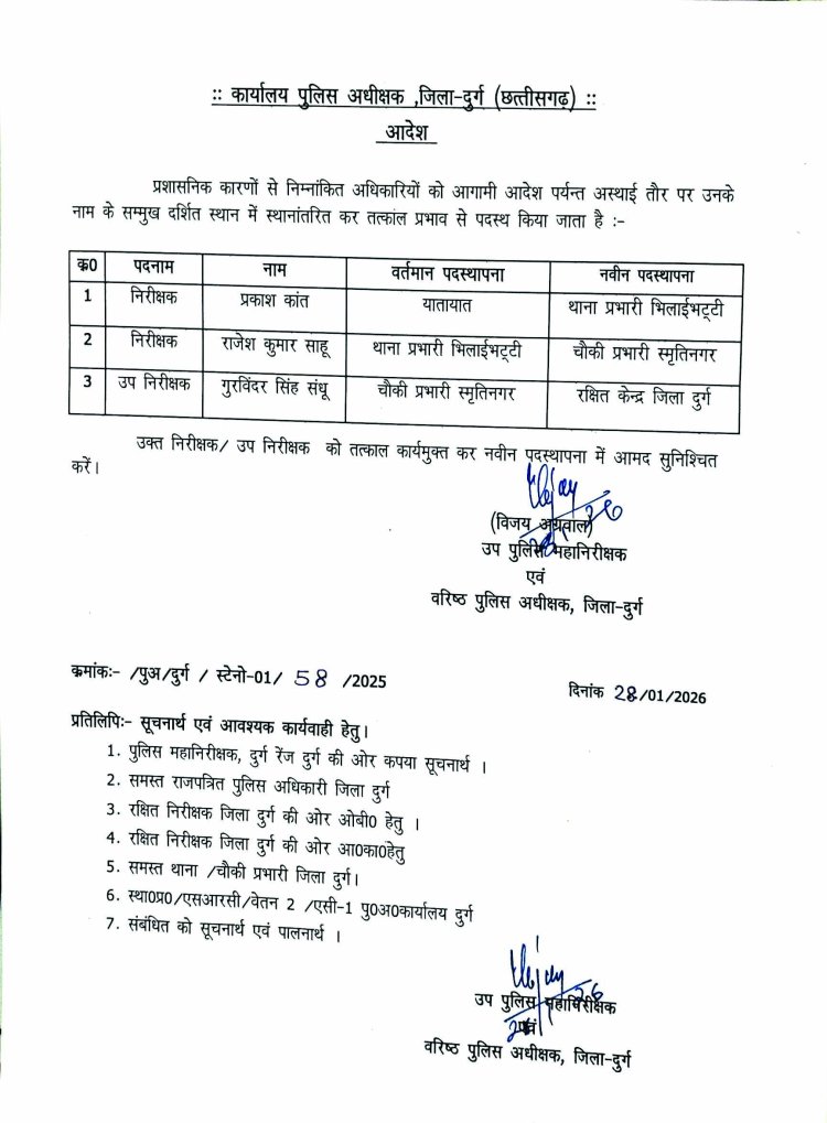 दुर्ग। जिले के स्मृतिनगर चौकी प्रभारी उप निरीक्षक गुरविंदर सिंह संधु को पुलिस अधीक्षक ने बुधवार को चौकी प्रभारी पद से हटाकर रक्षित केंद्र भेज दिया है। यह प्रशासनिक कार्रवाई ऐसे समय में हुई है, जब कुछ दिन पहले ही छत्तीसगढ़ हाईकोर्ट ने उनके आचरण की जांच कराने के निर्देश पुलिस महानिदेशक (डीजीपी) को दिए थे। वहीं निरीक्षक प्रकाश कांत को यातायात से थाना प्रभारी भिलाई भट्टी, राजेश कुमार साहू को थाना प्रभारी भिलाई भट्टी से चौकी प्रभारी स्मृतिनगर बनाया गया है।