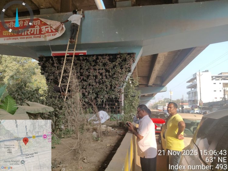 भिलाई नगर । नगर पालिक निगम भिलाई आयुक्त राजीव कुमार पांडेय के निर्देशानुसार, निगम क्षेत्र में अवैध रूप से लगाए गए प्रचार सामग्री के विरुद्ध सख्त कार्रवाई की गई है। यह कार्रवाई जोन क्रमांक 01 अंतर्गत वार्ड क्रमांक 17, सुपेला के घड़ी चौक से चंद्रा मौर्या तक ओवर ब्रिज के पिलर्स पर केंद्रित थी। इस क्षेत्र में विभिन्न प्रतिष्ठानों द्वारा अवैध रूप से लगाए गए होर्डिंग, बैनर और पोस्टर को हटाने का अभियान चलाया गया।